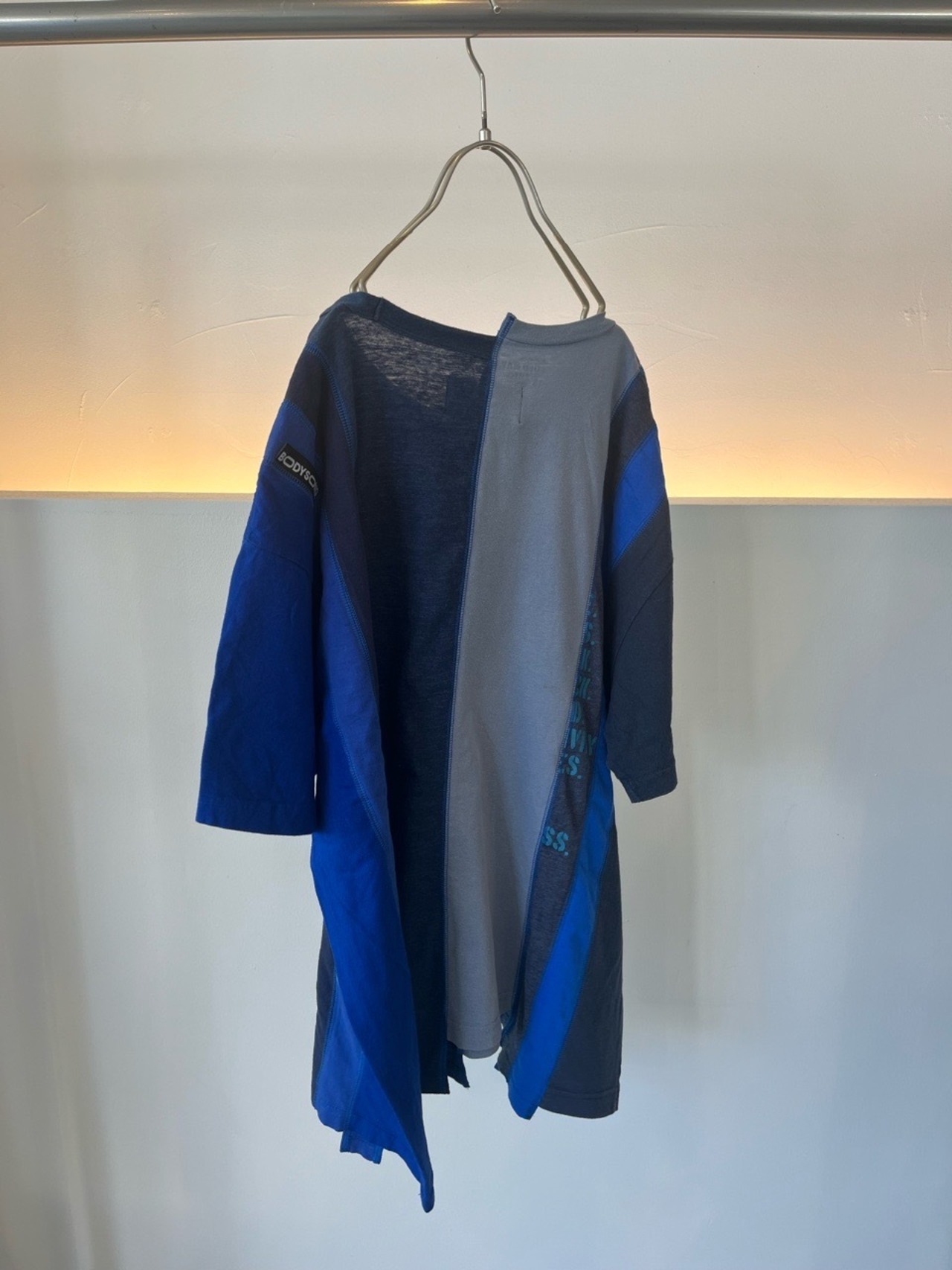古着のTシャツを縦に細切れにしてパッチワークしたTシャツ。