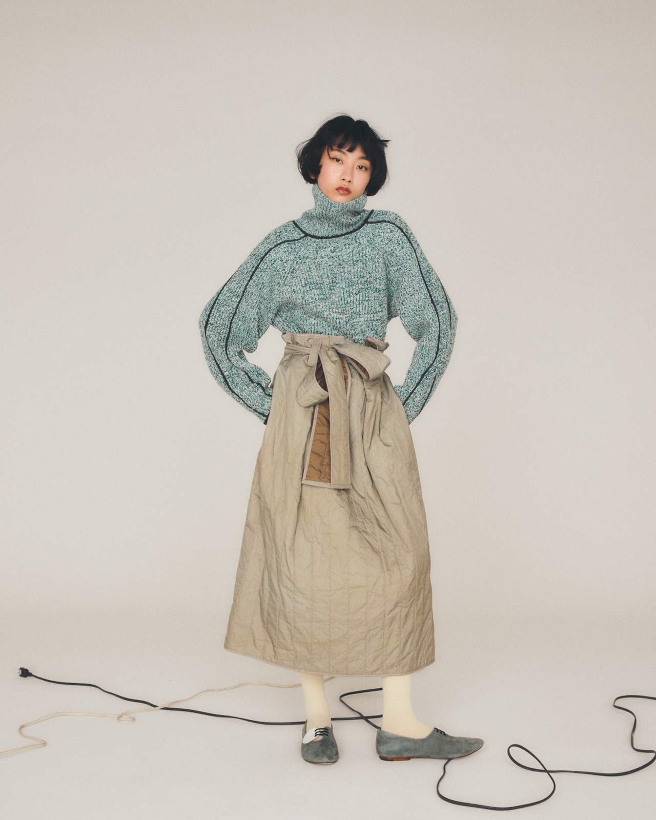 柔らかく生地を染め上げる手法で染められたオリジナルのキルティング生地スカート。