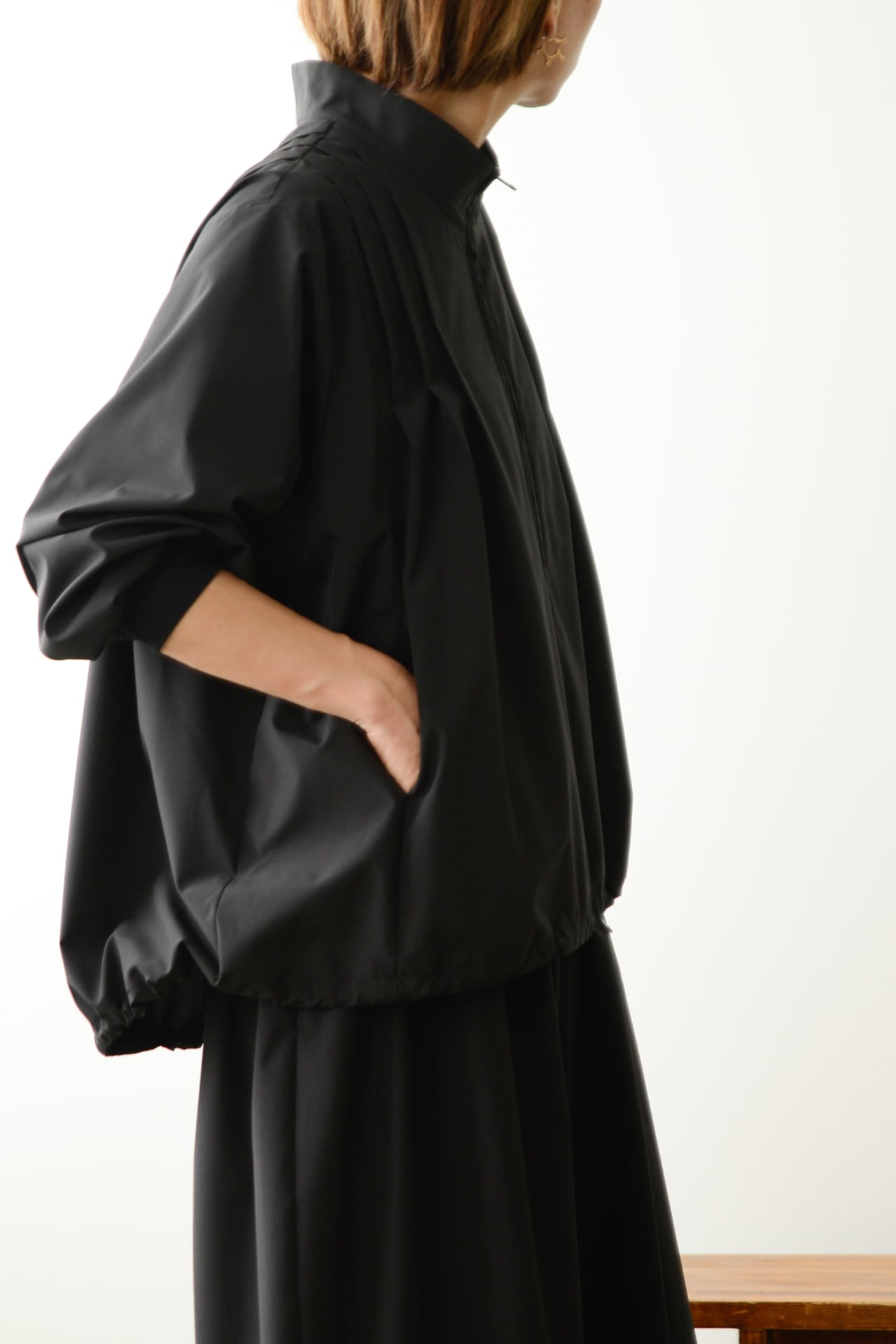 フロントジップのタフタブラウスブルゾン。