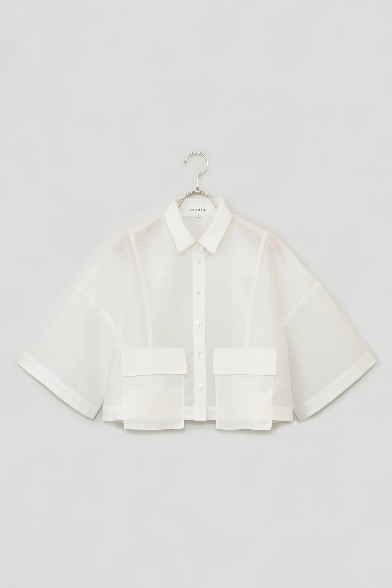 ぐっと短めな丈感と、ボリュームのあるシルエットのデザインシャツ。