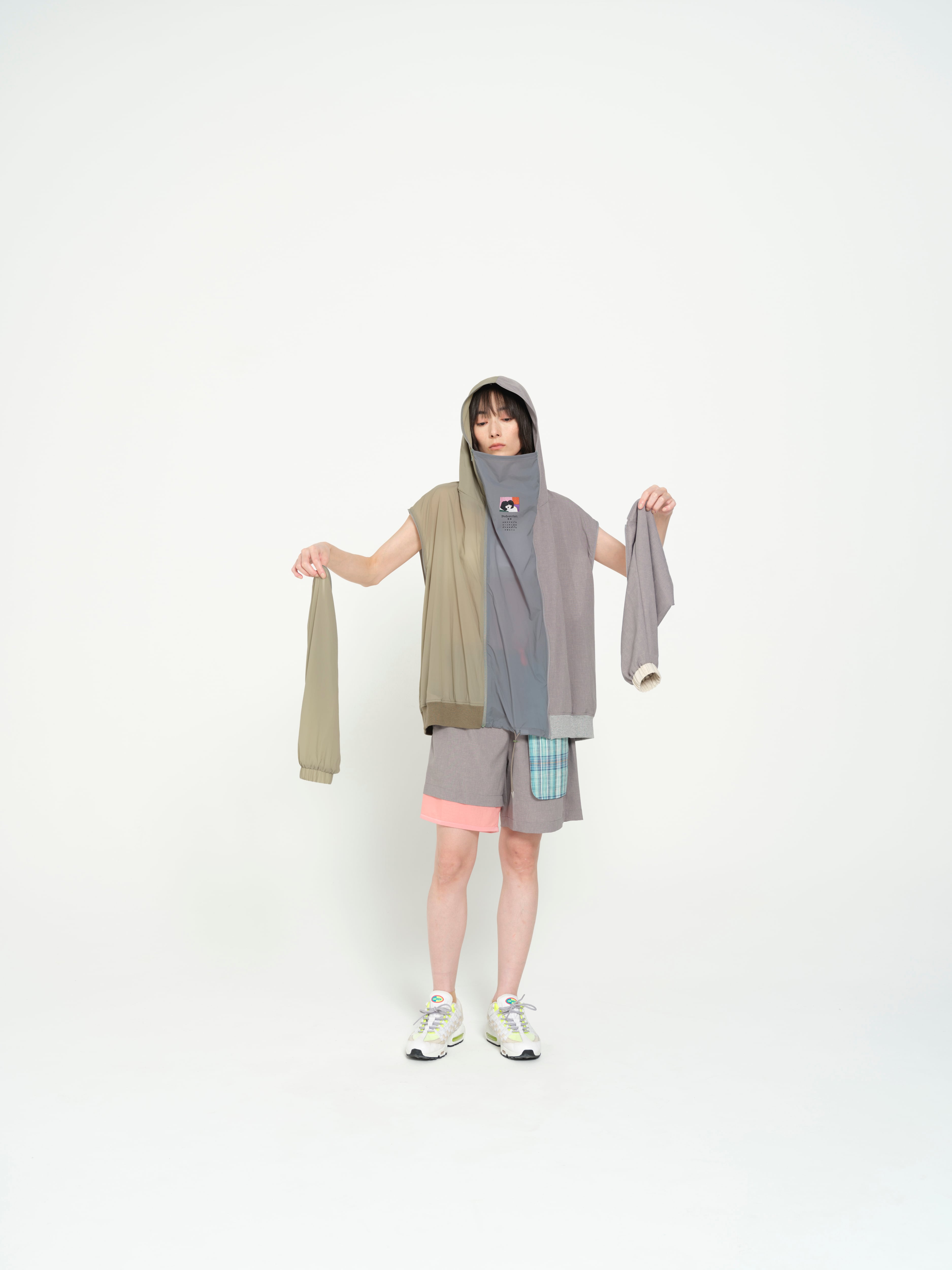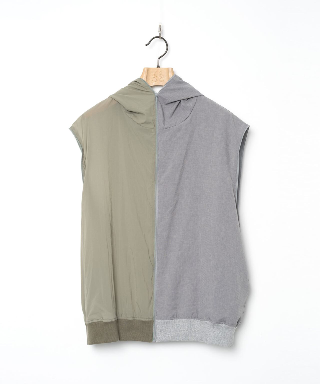 袖を外してノースリーブベストに、前身中央を外してシンプルなパーカーにしたり、