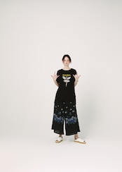 テロテロの落ち感が魅力的なAラインシルエットのデザインTシャツです。