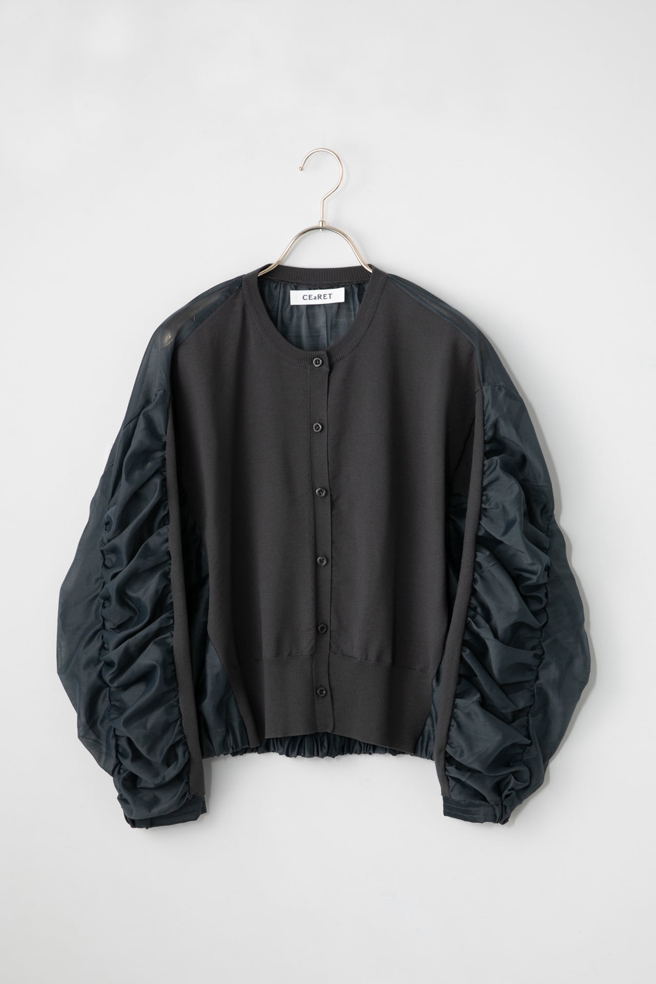 袖と後ろ身頃の布帛部分には、程よいシアー感のあるテンセルポリエステルの素材を使用。